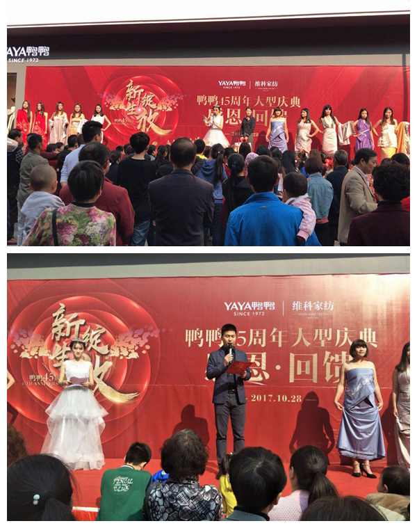 2017年10月28日,維科集團旗下全國首家集合店在江西共青城市盛大開業。開業慶典活動人氣爆棚,活動進行兩天銷售突破10萬元。28日早上以歡快的鑼鼓聲開場,吸引了店鋪周邊的共青市民駐足。維科家紡用床單和被套做裹布秀出場,模特優雅的步伐,配合主持人對每款產品FAB的介紹,讓廣大消費者對維科家紡歐了全新的認識。隨后呀呀實體店管理公司南大區經理李海泉發表開業致辭。事業部副總經理楊躍輝、維科家紡總經理王吉鋒、鴨鴨股份公司總經理徐相圣等領導進行開業剪彩,并陪同當地政府有關領導到敬老院進行了愛心捐贈,相關媒體全程跟蹤采訪報道。此次開業慶典活動,不僅提升了鴨鴨品牌的美譽度,更擴大了維科家紡在當地的知名度。